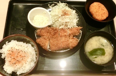 チキンカツ定食完食しました。ご飯 普通盛り、コロッケ サービス。