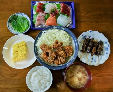唐揚げ、刺身の盛り合わせ、焼き鳥などを食べました