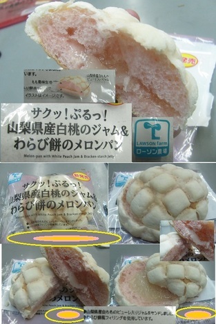 閲覧者の皆さん、こんにちはローソンローソンベーカリーのサクッ!ぶるっ!山梨県産白桃のジャムわらび餅のメロンパンですパンを見たら白桃ジャムだけかと思った