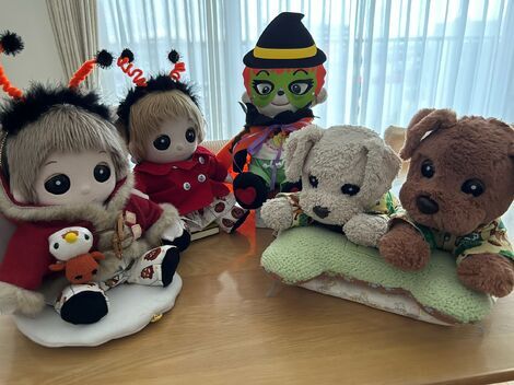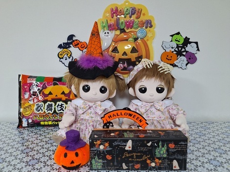 今年の我が家のハロウィンは、シマナガエ君が初参加だよ。💖それから、後ろの絵手紙にミャクミャク君も僕もいれてってやってきたよ。小さいけれどわかるかな?😉