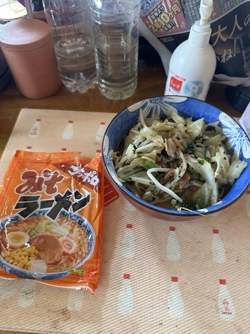 ■今日のインスタント麺について教えてください!麺のスナオシサッポロみそラーメン具材キャベツほうれん草ニラもやしチャーシュー(小間切れ)鶏のササミ香辛料