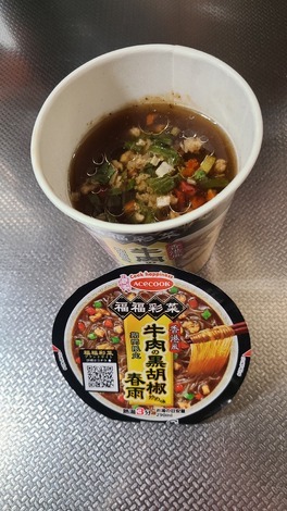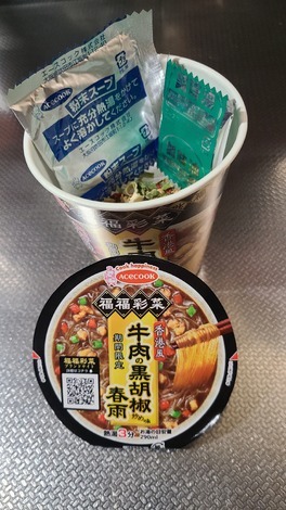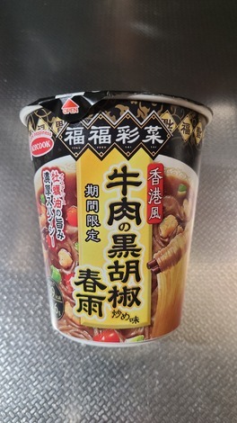■今日のインスタント麺について教えてください!今日は、エースコック「福福彩菜香港風牛肉の黒胡椒炒め味春雨」を食べました。