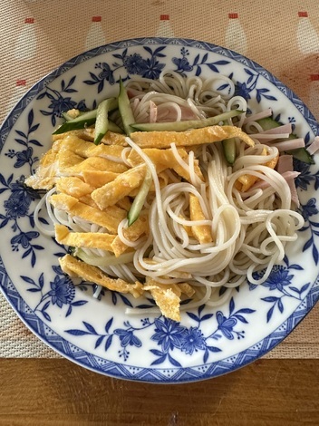 ■今日のインスタント麺について教えてください!そうめん(メーカー不明)具材ロースハムきゅうり錦糸玉子つゆメーカーワダカン昼食時にブッカケ冷やし素麺にし