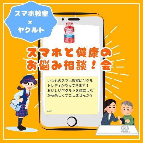 よりどこ会員のみなさんこんにちは😆今日は、11月のスマホ教室×ヤクルトコラボイベントのご紹介です。「スマホと健康のお悩み相談!会」いつものスマホ教室に
