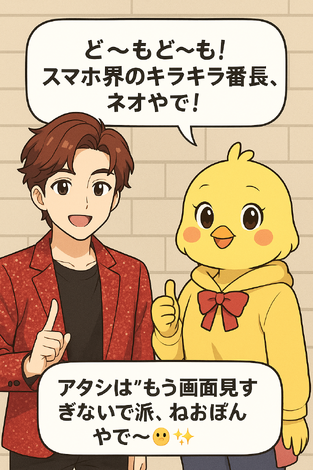 👦ネオ「どーもどーも!今日もキラッキラに登場〜✨」👧ねおぽん「はいはい、勝手にライト当てんといて!まぶしいねん😂」👦ネオ:「なぁなぁ、Androidが