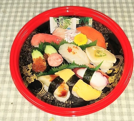 お墓参りの日は供養として故人の好きだったお寿司を仏壇に供えて居ます。少し豪華です