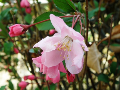 温室を覗いてみたらカイドウが可憐な花を付けていました。