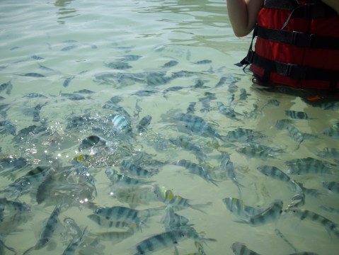 サピ島は魚の観察にはとても良いところです。色々な魚が簡単に観察出来ます。初心者にもお勧めします。しかも、しかもですよ!パンくずでも与えたなら、身体の周りに数千匹といっても過言でないほどすり寄ってきます。また、小さい魚(めだかサイズ)は餌がなくても身体の垢(あか・角質層)を求めて体を掃除に来てくれます。その感触の良いこと!とても言葉で表現できません。