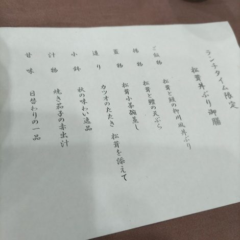 松茸のランチ とても美味しかったです久しぶりの松茸 やはり香りが良いですねメロンさんの食べられた土瓶蒸しは無かったです。2日前に予約がいるみたいでした!今度は、予約して行きたいですね!