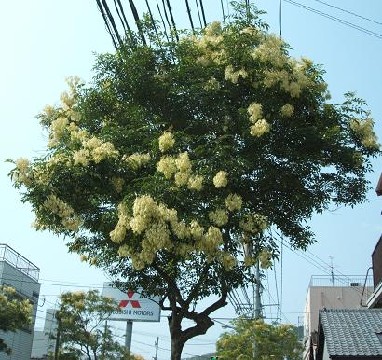 いつも行き返り川沿いを歩いているので本道の方の街路樹が白くなっているのに気付きませんでした。春に白い花を付けて秋に種が茶色になってヒラヒラ落ちてきます。