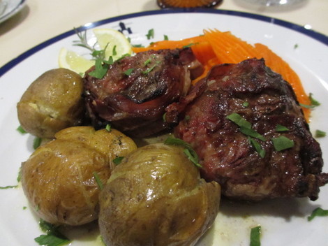 今回の夕食はPromocionということで、宿代込なので、Menu的には肉か魚か選べばいい程度です。魚を聞けば、「タラ」と即答なので、「肉、肉でいい。肉だから、ワインはDouro Tintoでいい」と決まって、のんべんだらりと真っ暗な外を見ていると、前菜がきました。実はこの前菜がメインかな?と思った感じなんですが、午後散歩しながら食べた生ハムが中に巻いてあるんですが、生ハムは生ハムで食べる方が、あっさりしているし、美味しいよな・・・ということで、塩辛くて半分で撤退。
