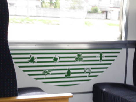 車内はすきすき、こんな島根米の宣伝なのか、デザインもありました。しかし、この電車、1時間にほぼ1本なんです。ここまで空いているって、みなさんは車移動なんでしょうか?