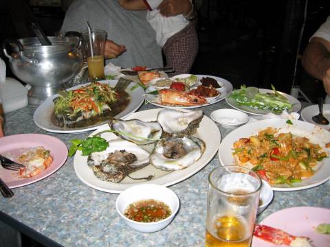 日本人定番?の「プー・パット・ポング・カリー」(カニの卵とじカレー)、生牡蠣、「プラー・サーム・ロット」(魚の香草煮付?)、焼き海老などを食べました。