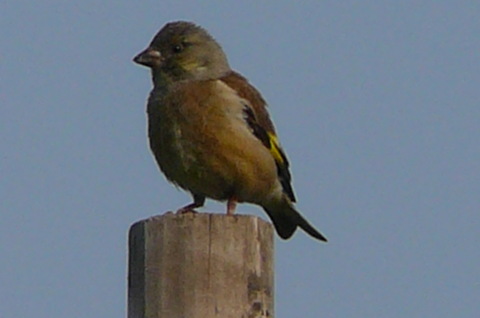 こちらも家の近くでもよく鳴いています。矢車草の種を啄ばみに庭に来たこともあるカワラヒワ、スズメぐらいですがちょっとずんぐりして嘴も太く、羽の黄色が目立ちますよ!