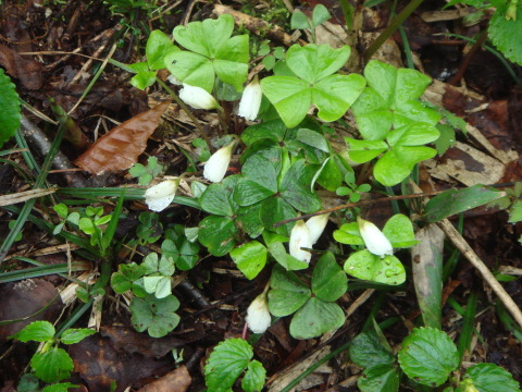 鳩待峠から尾瀬ヶ原で見た花ザゼンソウ。痛んでいますが、見た時は嬉しかった!エンレイソウ。二輪草?葉は、カタバミに似てますが・・?