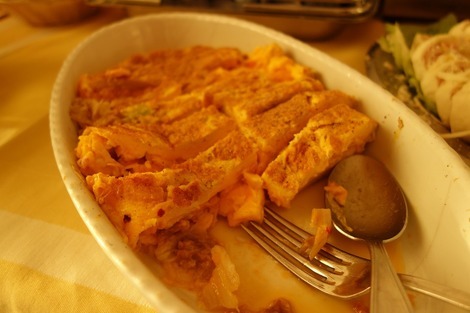 お肉やハムが入った大きなオムレツ。
