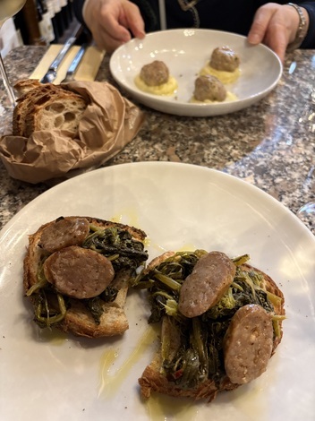 私はチーマ・ディ・ラーパ(代表的な冬野菜)のくたくた炒めととサルシッチャのクロスティーニ、姉はマッシュポテトのベッドに乗ったポルペッテ(肉団子)