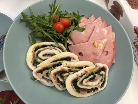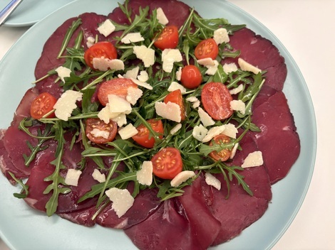 ブレザオラ(牛赤身肉の生ハム)にルーコラとミニトマトを合わせるのは定番です。