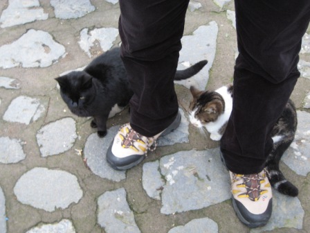 こちらは別な猫。Ginaさんのダンナ様の足に絡みつくように2匹が寄ってきました。