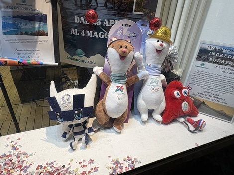 ミロ(茶色の子、ミラノから名前をもらった子で、片足がなくて、尻尾を上手く使って歩く、パラリンピックの象徴)とティナ(コルティナから名前をもらった子)左には東京五輪のミライトワ、右にはパリ五輪の子。