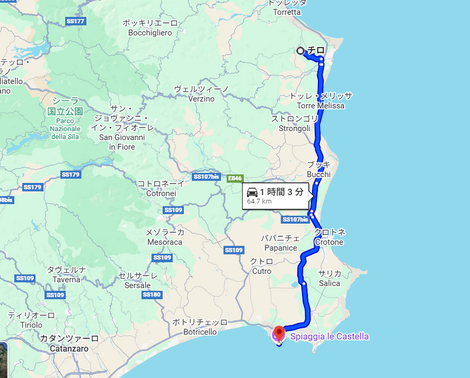 地図でLe Castellaとクロトーネ、チロの位置関係を調べてみました。