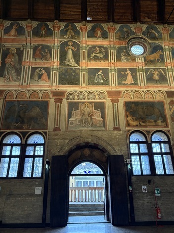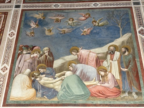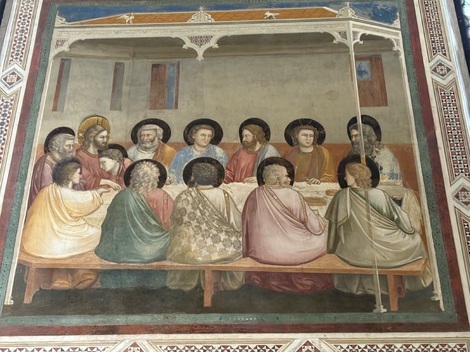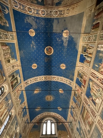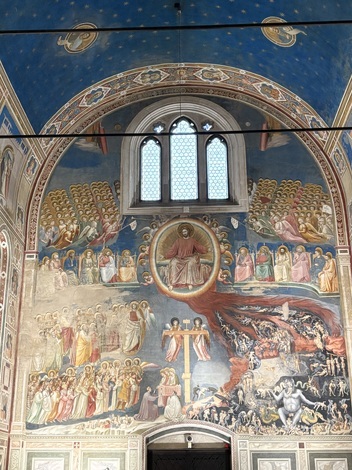 以前も書いているのですが、ご存じない方のために書くと、ここは、地元の富裕な高利貸しであったエンリコ・スクロヴェンニによって14世紀初頭に建てられた礼拝堂で、内部はフィレンツェ出身の「イタリア絵画の父」「ルネッサンス絵画の先駆者」と呼ばれるジョットと、その弟子が描いた素晴らしいフレスコ画に覆われています。