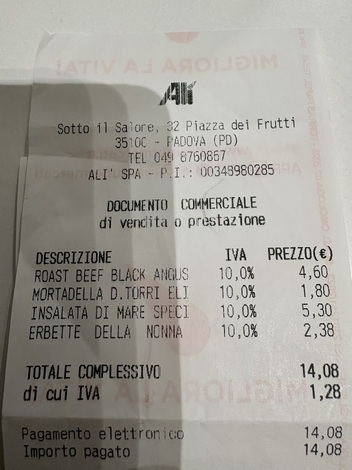 え?たったの100g?と言うような顔をされたのに、モルタデッラもウネット、海鮮サラダもウネット、と注文していたら、野菜のときには、こちらがエルベッテ・デッラ・ノンナまで行ったら、店のオニイサンにウネットと言われてしまいました。