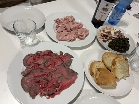 手前がアンガス牛のローストビーフ、その奥がピスタチオ入りのモルタデッラ、その右が海鮮のインサラータと青菜のくたくた煮(正式名称はエルベッテ・デッラ・ノンナ=おばあちゃんの緑野菜というところ)