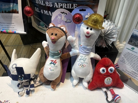 店のウィンドウに、ミラノ・コルティナ・オリンピックのマスコットキャラクターのティナとミロが飾ってありました。