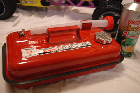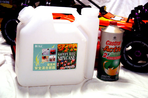 3.ガソリン、オイル混合容器。園芸用というのが泣かせます。手軽に混合できます。しかし、あらかじめ25:1に混ぜられた物が売られているのですね.....でも管理人は最初は、ハイオクとカストロールをFuelieに喰わせてやりたかったので、あえて贅沢してみました。