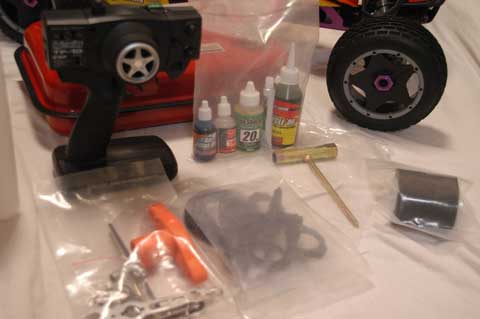 2サイクルオイル、デフオイル、エアフィルターオイル、ショックオイル、レンチ系工具、予備のエアフィルターなどが入っています。