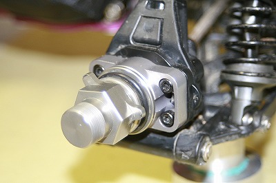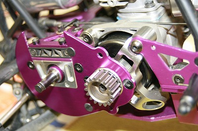 もう一つ、後ろの方に映っているのが、最近関東支部では、定番の兆しのあるもう一つのベアリングキャリア この部品、まず組んでみて精度のよさがよくわかる部品である。 駆動回転系の軸心をキッチット押さえると共に、エンジンマウント位置やギアバックラッシも決まってくる。この周辺部品は、しっかりとした物を使ってあげた方が良いと思う。ブレーキの引きずりもスムースになり抵抗が低減したように感じている。また、アルミ化されたことによりネジロックを使えるようになり安心して走行を楽しめるようになる良い部品だと思っています。