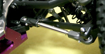 私の車両は、度重なる空中側転&着地失敗!?などが重なってかフロントのステアリングロッドが曲がっておりました。 ステアリングサーボで適当にニュートラルをあわせただけでまったく問題なく?走れていたので交換していませんでした。 ノーマルは、アルミ製なのでとても軽く良いのでしょうが私は、2回この部品がネジ部分で曲がってしまいました。 そこでEddyの部品をチョイスした訳です。 リアは、特に損傷暦は、無いのですが逆ネジになっていることからサスペンションの調整を行なうには、好都合と思い前後セットの物で購入しました。