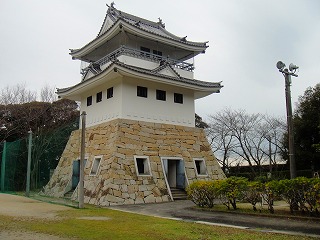 農道から小高い丘を登ると本丸跡に天守閣を模した展望台があらわれてきた。