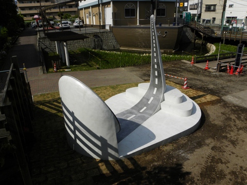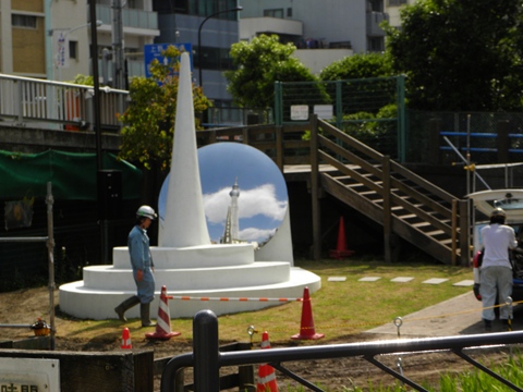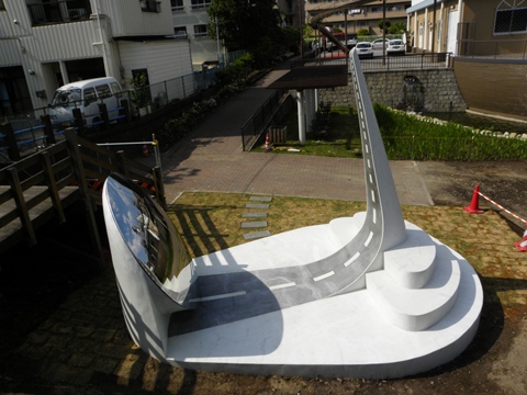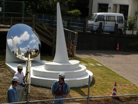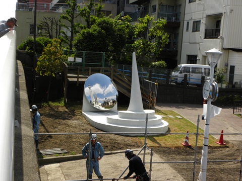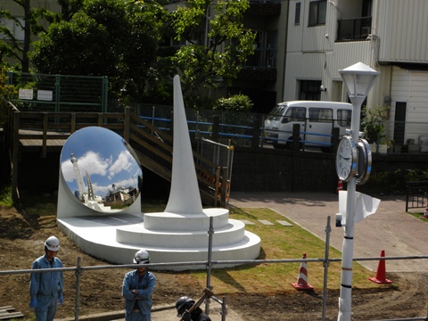 を暗渠にして造られた親水公園に、凸面鏡が置かれました。全体の形は