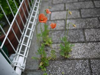 普通に土から出ているポピーはまだつぼみを付けていませんが、タイルの目地から発芽したポピーは、小さいながらにつぼみを付けました。タイルが太陽熱を吸収して、成長を促しているのかもしれません