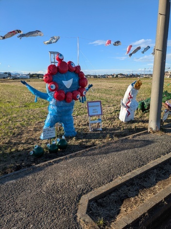 開催されており、途中コスモス畑を見つつ、案山子祭り会場には大阪万博の主役が、
