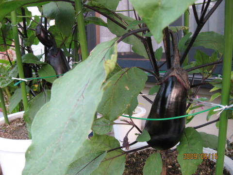 「ナスの鉢植え、「底面紐潅水」と「鉢底水浸」栽培。(5)初収穫。」