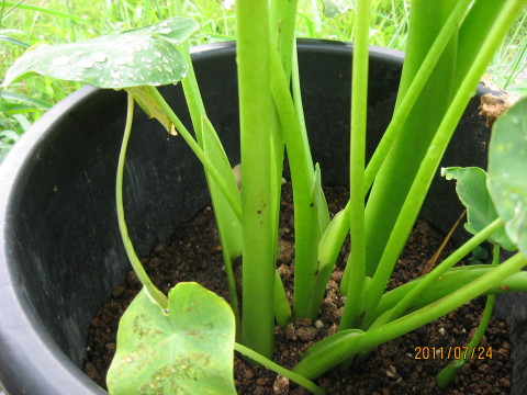 「里芋の鉢植え、底面潅水栽培。(7/24)」