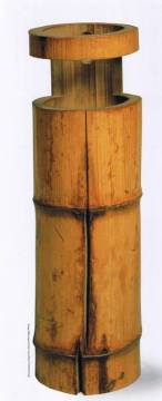 「園城寺の筒」とは、世上に名高い利休作の竹の花入のこと。ある茶会で、利休がこの花入に花を生け床にかけた。ところがこの花入、竹の表面に大きな割れ目があるため、水がしたたり落ち畳を濡らしてしまいました。見かねた客が、「これはどうしたものでしょうか」とたずねると、利休は、「水が洩れるところこそ、この花入の命なのです」と答えたという。