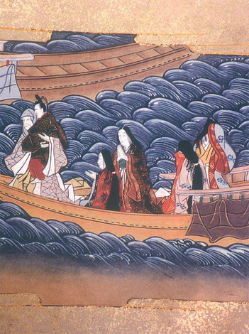 海上には赤旗赤標切り捨てかなぐり捨てたりければ、龍田川の紅葉葉を嵐の吹き散らしたるに異ならず。汀に寄する白波は薄紅にぞ成りにける。主もなき空しき舟は潮に引かれ風に任せて何方を指すともなく揺られ行くこそ悲しけれ。