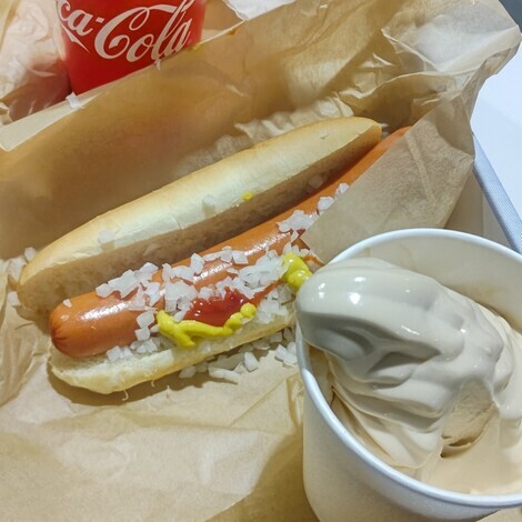 そして、真っ先にフードコートで、ピザとホットドックを