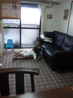 朝はいつも長男と双子ちゃんがはじめに起きてふたりでまったりテレビを観ています。