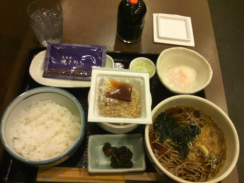 ご飯に納豆、焼き海苔、ミニたぬきそば、温泉玉子が付きます。