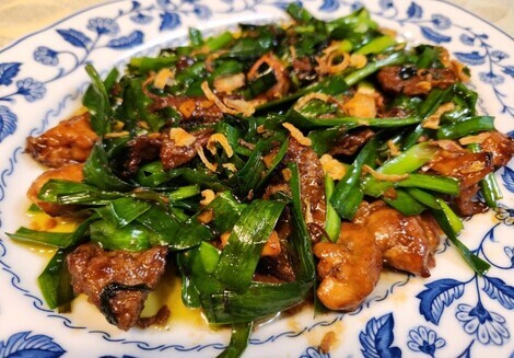 今回は串に刺して焼かず「ニラ」を加えフライパンで炒めました。