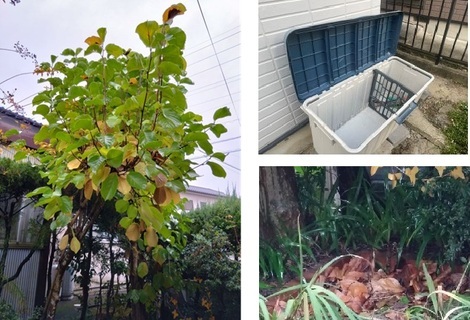 ・昨日息子宅へ参りました時に家の外に「大きなプラスチックボックス(下の右上写真)」がありましたので、「腐葉土作成に役立つかな?」と思いました。
