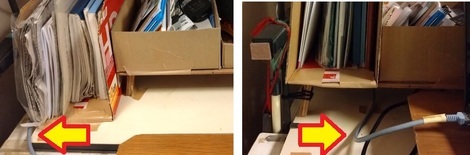 しかし、「LANケーブル(下の写真の矢印)」が書類入れの目の前にあったりしますので、一旦ファイルスタンドを外しまして、「棚をファイルスタンドの位置まで移動」しまして、ファイルスタンドは「棚の上に移動(右写真)」しました。