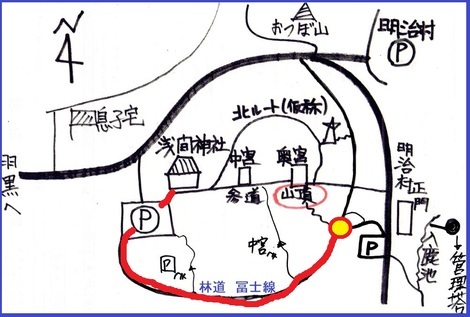 浅間神社へのお参りの後の「午前11時50分から午後1時」まで、下の地図のごとく今週も「林道冨士線」のお散歩でございました。