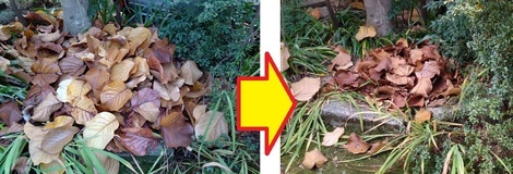 私が元会社後輩の畑で奮闘しているとき、ふーたんは「オーバーフロー下木蓮の枯れ葉(腐葉土作り場所:下の写真)」の整理を・・・!