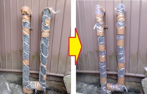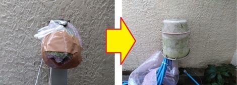 次に「外の水栓」ですが、ここもすでに「凍結対策済み」ではありますが、左写真のごとく「ショック材(私どもは「ピチピチ」と呼んでいます)」を巻きまして「レジ袋」をかぶせました。
